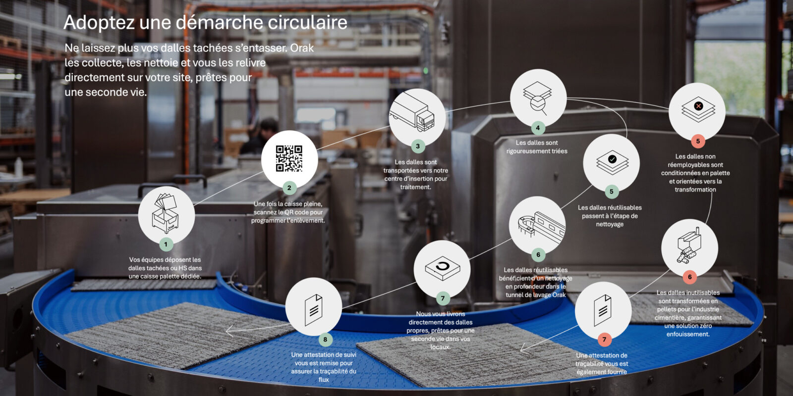 Grâce à nos solutions de cartographie, de nettoyage, de réemploi et de reconditionnement, chaque dalle trouve sa voie de valorisation.